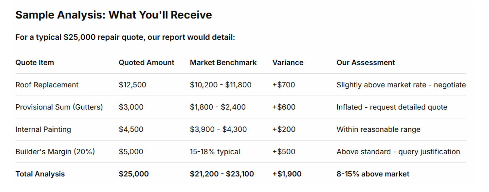 We review every line item, including labour, materials, margins and provisional sums, and compare each to current local market pricing.